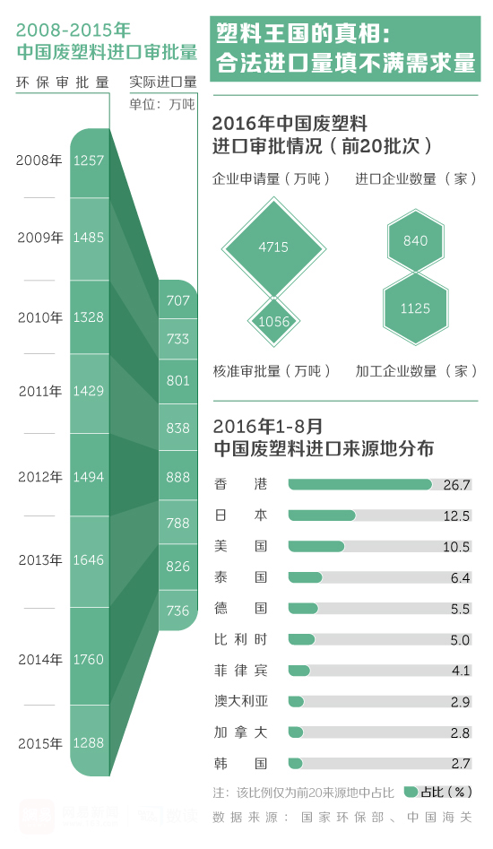 同时,从国外进口一吨废塑料的价格只有进口塑料原料价格的三分之一,算上加工成本也只有使用原料的二分之一,对商人们来说,这显然是一门有利可图的大生意。根据环保部的数据,2009年全国进行废塑料进口加工的合法企业数量就有多达1600家,被批准的废塑料进口量达到1484万吨,但这也仅是企业申请量的五成左右,2016年这一审批比例下降到了1/5。而实际进口时,在海关检验等各种因素影响下,废塑料的实际进口量只有审批量的50%,其背后的走私量就不得而知了。