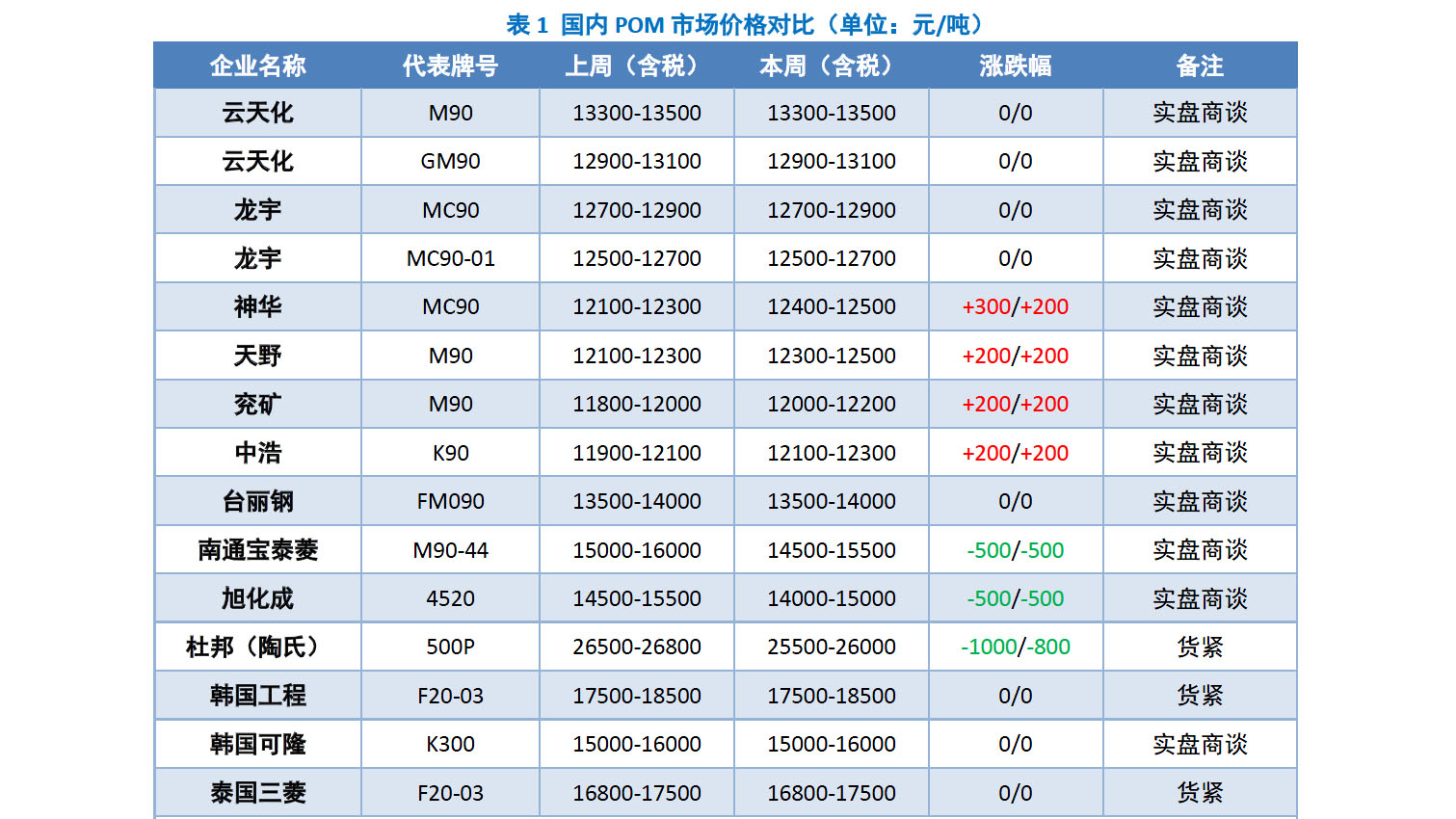 本周国内POM市场震荡整理,交投气氛表现尚可。周内市场表现不一,呈现区域性行情分化走势,华东市场国产料部分牌号小幅走高,涨幅100-300元/吨,进口料部分报盘大幅走跌,跌幅500-1300元/吨;华南市场国产料个别牌号走高,涨幅50-100元/吨左右,进口料报盘稳定。周内部分国产料厂家上调出厂价格100-200元/吨,市场紧跟涨势,成交重心小幅上移,仍有部分国产料库存压力较大,价格暂无明显波动,贸易商周内及时补充库存,下游用户买涨不买跌心理影响,备货心态较为积极,仍有部分下游工厂库存消化能力有限,小单灵活跟进为主;高端进口料需求跟进有限,报盘大幅走跌,贸易商操盘随行就市,整体购销较为平淡。截至4月4日(周四)午后14:00,华东余姚市场云天化M90含税参报13300-13500元/吨,华南东莞市场无税参报12100-12200元/吨。