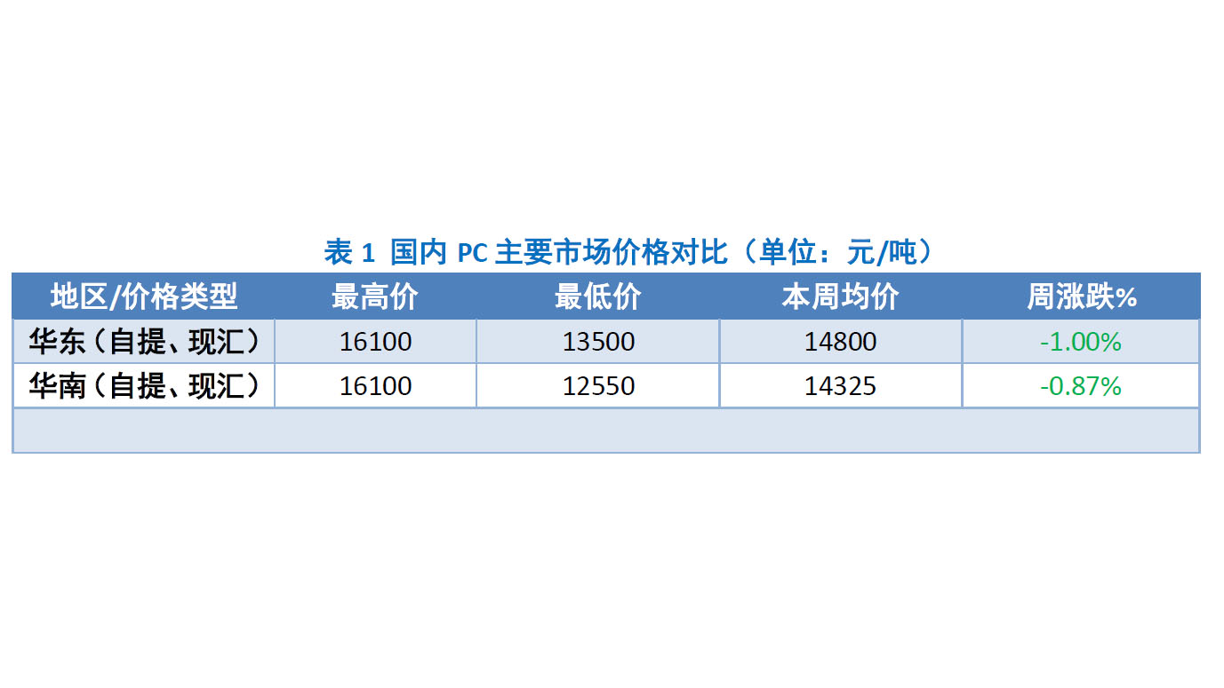 本周国内PC 市场整体偏弱震荡。需求一般,场内消息指引有限,商家操盘多观望。分 区域来看,华东市场小幅下行,各主流牌号跌幅在50-250 元/吨;华南市场涨跌互现,商家 操盘多积极,多依各牌号情况调整报盘,主流牌号跌幅在50-200 元/吨,部分牌号小幅上涨 50-100 元/吨。 周内,下游需求面整体未有改观,市场出货节奏仍显迟缓。原料双酚A 报盘持稳,国 内PC 生产企业出厂报盘多以稳为主,市场内整体消息匮乏,商家操盘积极性走弱,多以观 望报盘为主。市场内部分进口料成本面高位支撑,商家持续走低空间,多以实盘小幅让利促 成交为主。周初,华南地区部分贸易商多有看涨意向,报盘小幅调涨50-100 元/吨,但难以 带动市场整体,报盘趋稳运行。截止今日,华东注塑级中低端商谈参考13500-15600 元/吨 (含税),华南注塑级中低端商谈参考12550-14280 元/吨(不含税)。华东地区:华东PC 市场小幅下行,各主流牌号跌幅在50-250 元/吨。市场交投延续弱 势,商家出货迟缓,贸易商操盘多有谨慎,多依据各牌号走货情况调整报盘,实盘以商谈为 主。截止今日,华东注塑级中低端商谈参考13500-15600 元/吨(含税)。 华南地区:华南PC 市场涨跌互现,商家操盘多积极,多依各牌号情况调整报盘,主流牌号跌幅在50-200 元/吨,LG 化工部分牌号因价高跌幅高达300 元/吨,部分国产料报盘小 幅调涨50-100 元/吨。需求有限,部分商家虽有调涨意向,然下游跟进平平,报盘持续走高 难以形成,商家后期多以稳为主。截止今日,华南注塑级中低端商谈参考12550-14280 元/ 吨(不含税)。