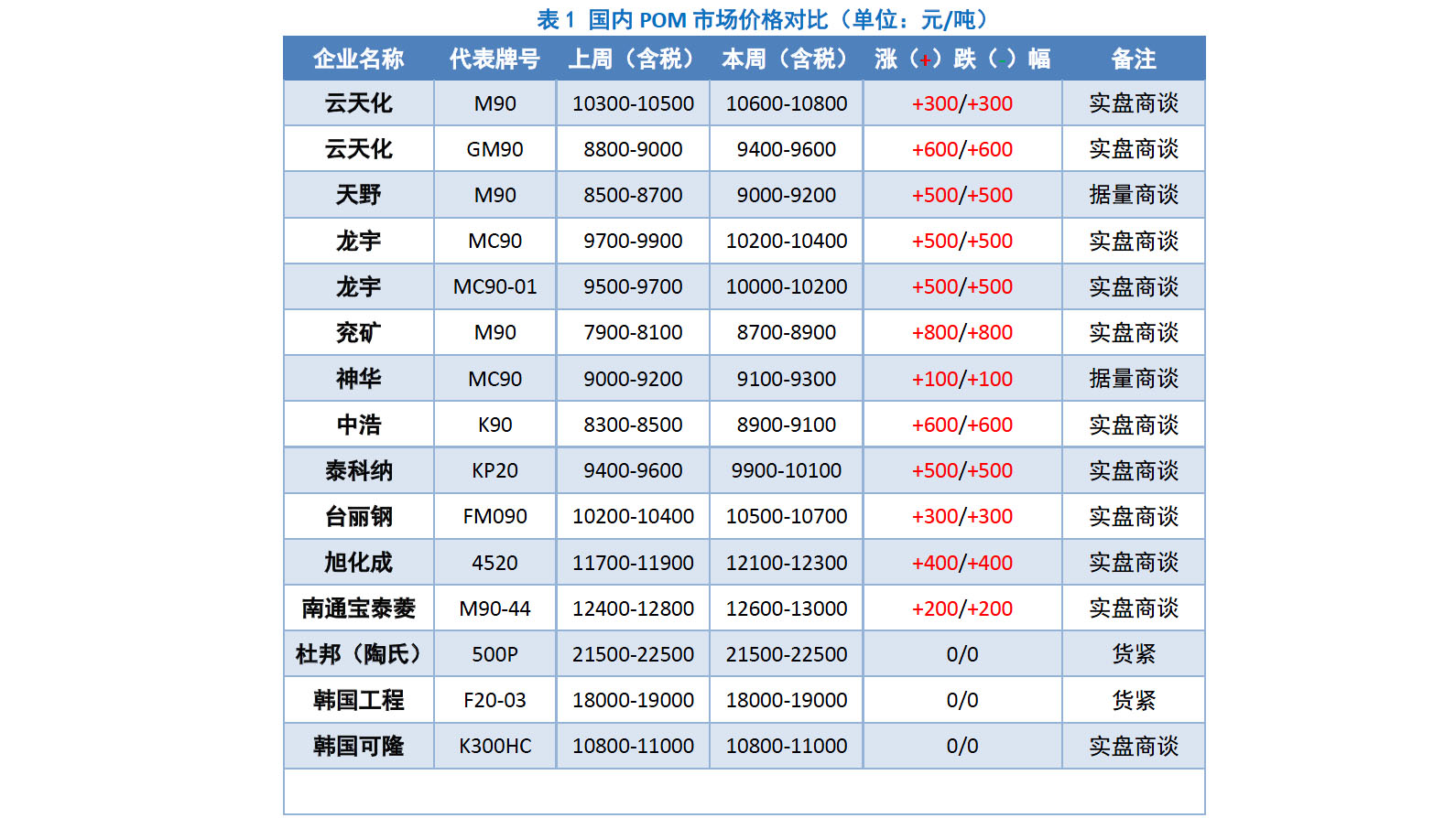 本周国内POM市场继续走高,成交灵活跟进。周内上游原料甲醇市场偏弱走跌,POM部分国产料出厂价格上调,华东市场国产料市场主流牌号走高100-800元/吨,进口料部分走高200-500元/吨;华南市场主流牌号走高300-700元/吨,进口料部分牌号走高200-650元/吨。 周内各地炒涨气氛浓烈,云天化、龙宇出厂价格小幅调涨,国产料现货供应偏紧,成本面支撑力度较强;受货紧影响,贸易商惜售心态不减,POM市场报盘继续跟涨,主流牌号涨幅100-800元/吨,仍有部分贸易商持谨慎观望心态,随行就市出货为主;下游企业开工负荷较低,然由于市场炒涨气氛刺激,下游用户买涨不买跌心理,采购行为表现活跃,成交实单商谈。截至4月23日(周四)午后14:00,华东余姚市场云天化M90含税参报10600-10800元/吨,华南东莞市场无税参报9500-9700元/吨。